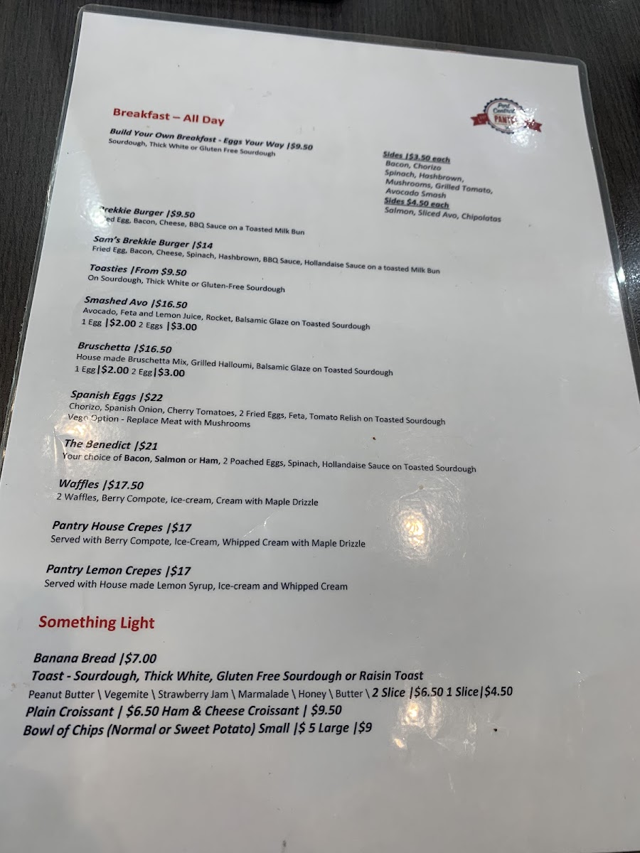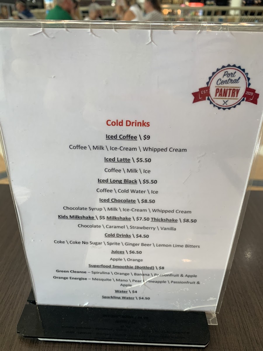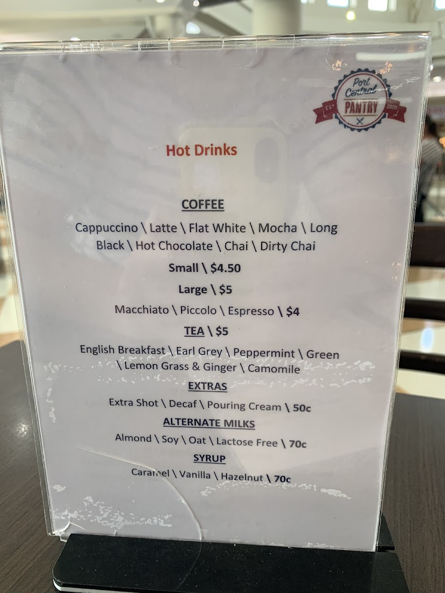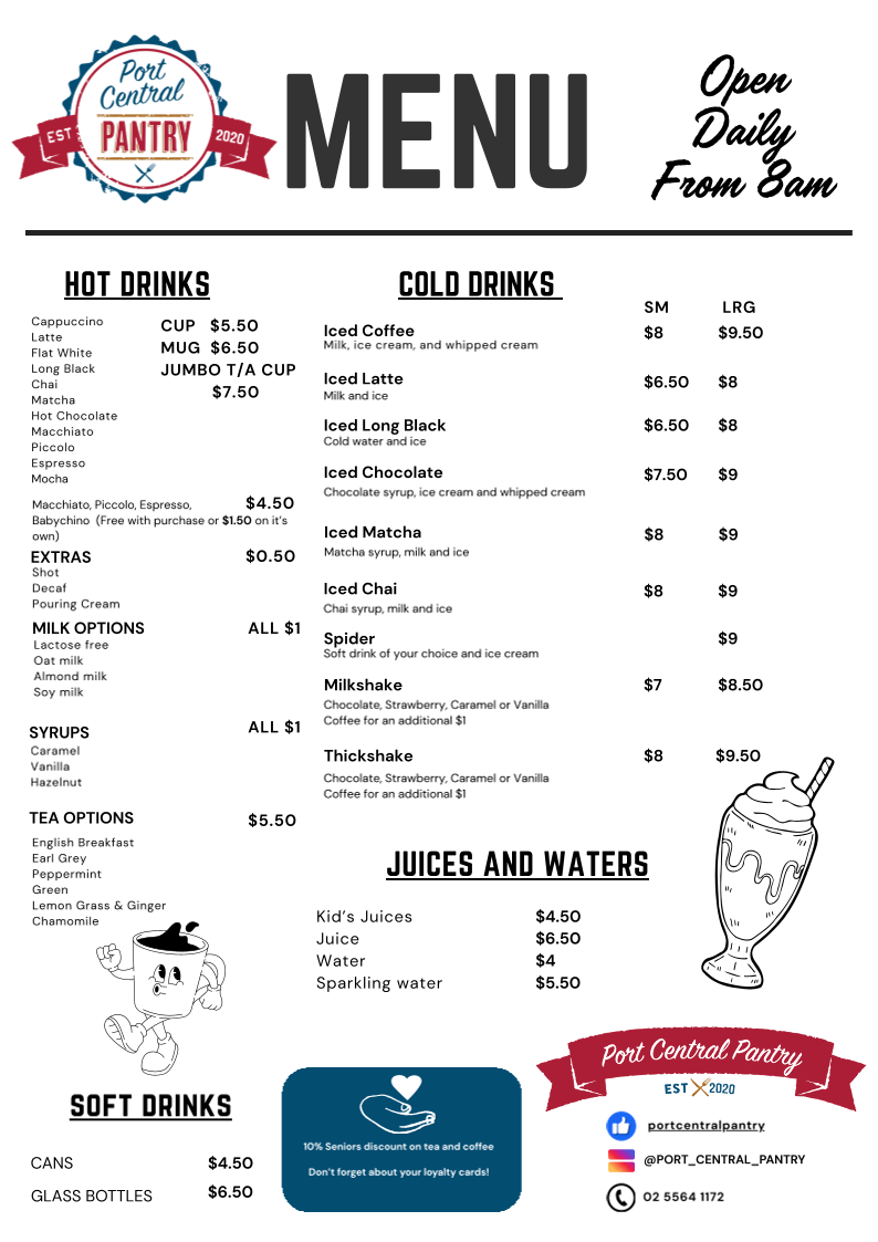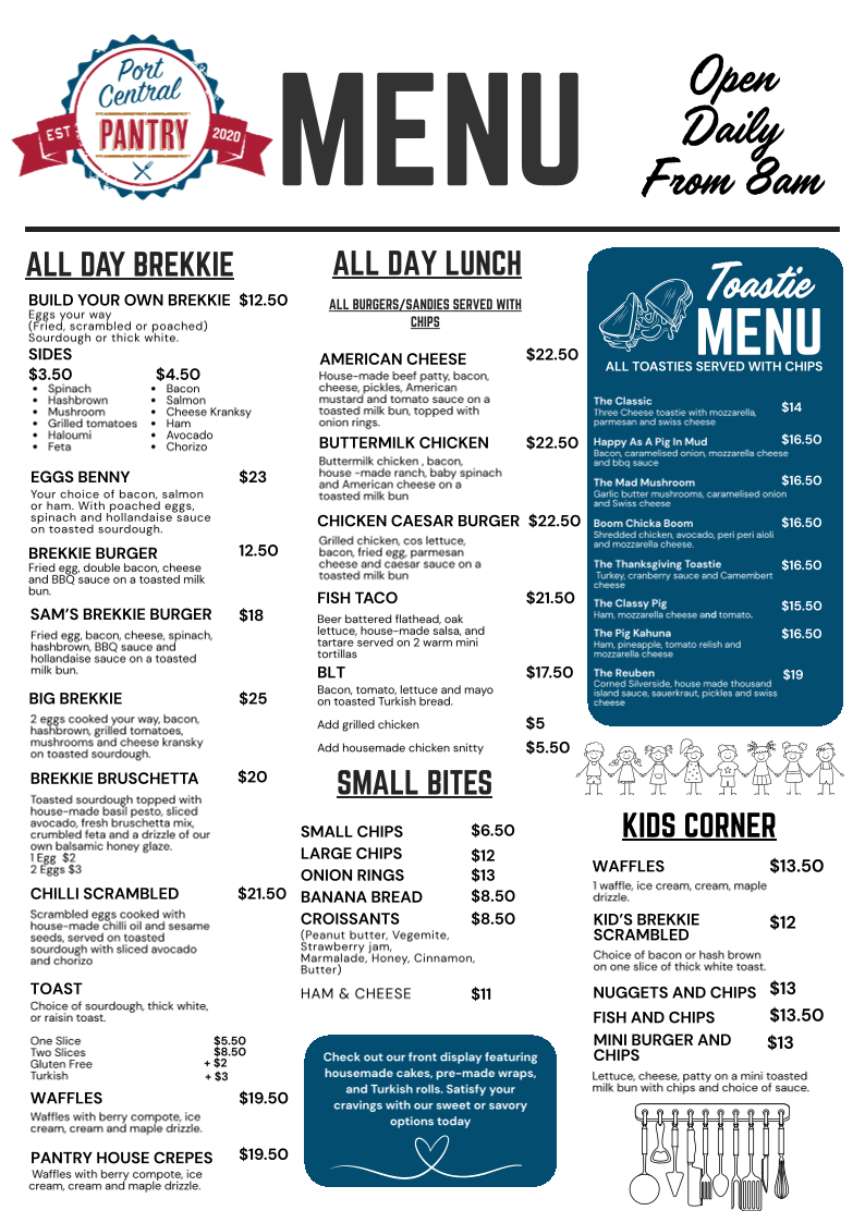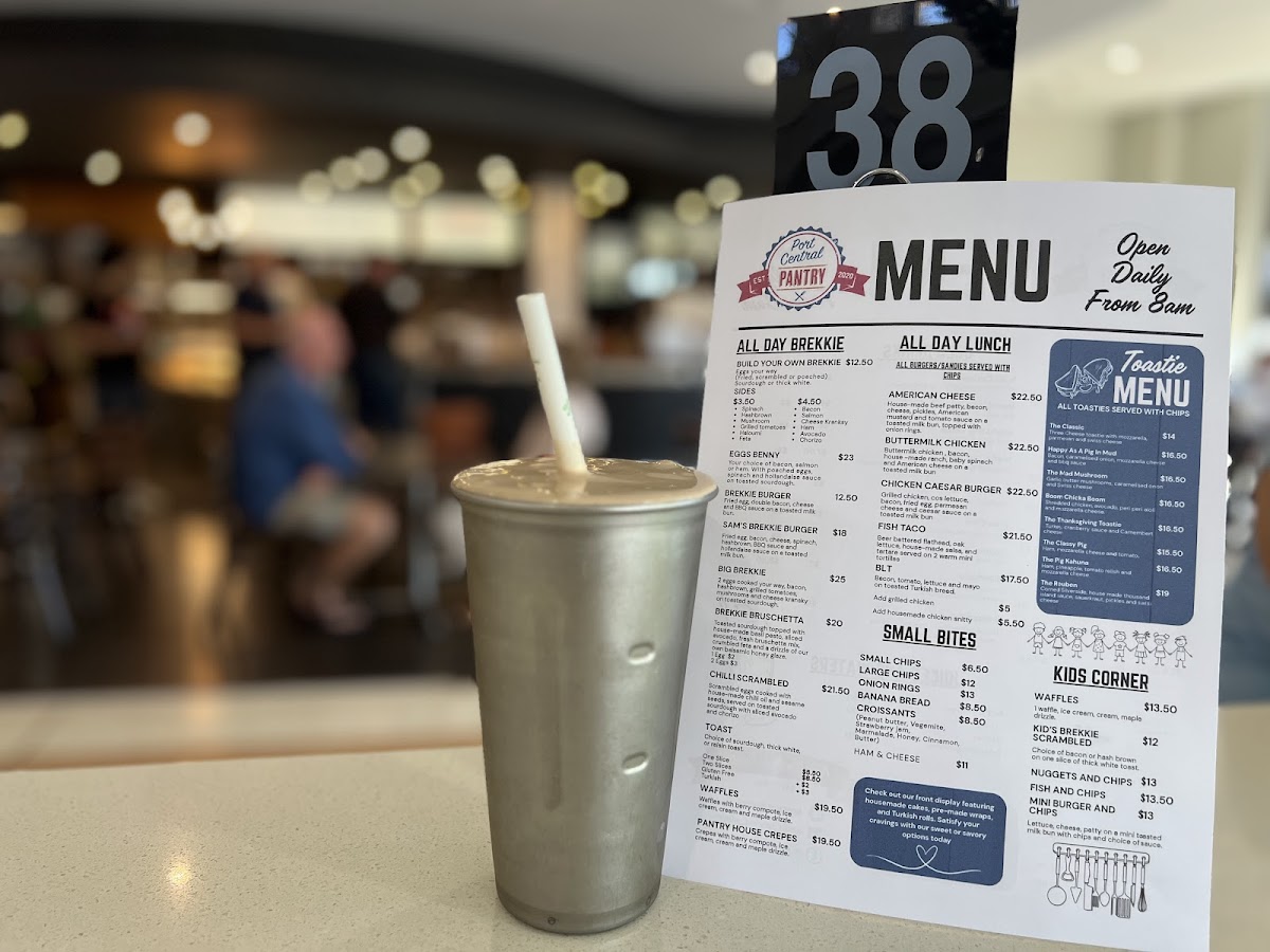 From a reviewer’s perspective, the menu at Port Central Pantry offers a broad and satisfying selection that covers everything from breakfast classics to hearty lunch options and quick bites. Popular breakfast choices like Build Your Own Breakfast, Smashed Avo, Bruschetta, Breaky Burger, and Spanish Eggs set a strong start to the day, while the all-day options such as Eggs Benny, Sam’s Brekkie Burger, and the Big Brekkie provide filling choices for any time. For lunch, items like the Buttermilk Chicken, Chicken Caesar Burger, Fish Taco, and BLT add variety and flavor. The toastie range, including The Classic, Happy As A Pig In Mud, The Mad Mushroom, Boom Chicka Boom, and The Thanksgiving Toastie, offers comforting, casual meals, while smaller bites like Small Chips, Onion Rings, Banana Bread, and Croissants are perfect for light snacks. Families are also well catered for with kids’ meals such as Waffles, Nuggets And Chips, and Mini Burger And Chips. Paired with a full drinks menu featuring Cappuccino, Latte, Flat White, Iced Coffee, and fresh juices like Green Cleanse and Orange Energise, the menu overall feels well-rounded, approachable, and suitable for both a quick coffee stop or a relaxed meal.